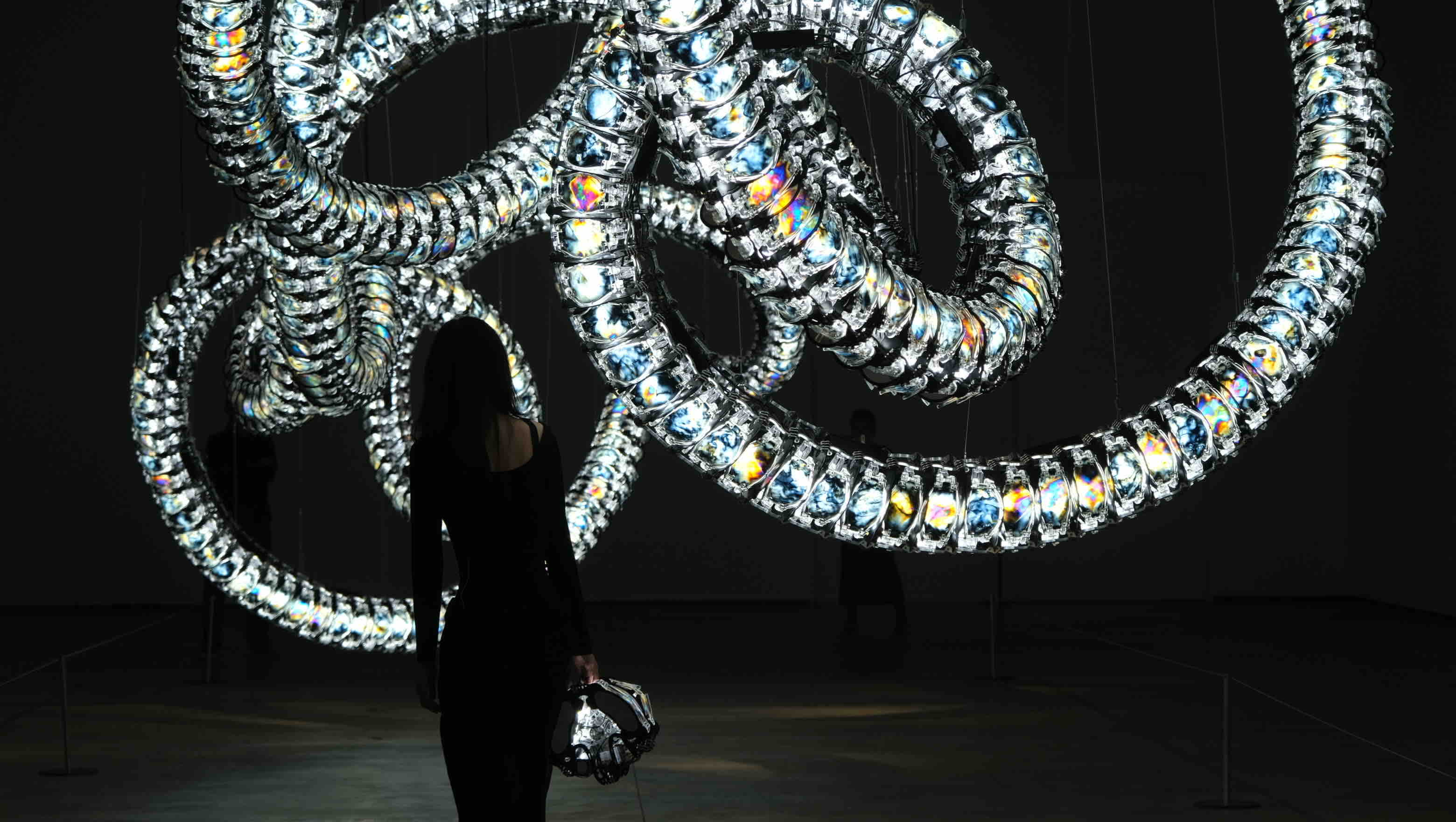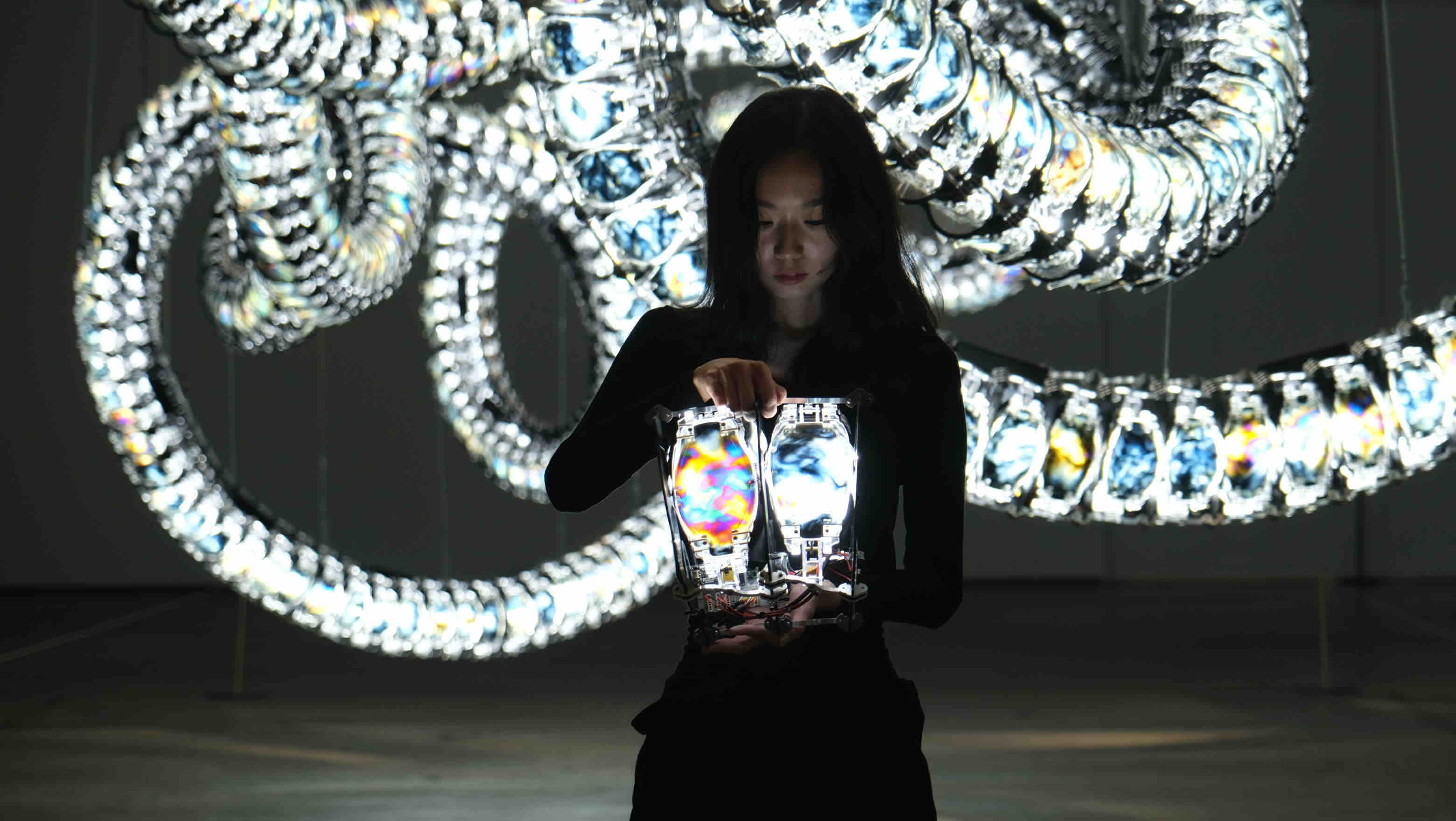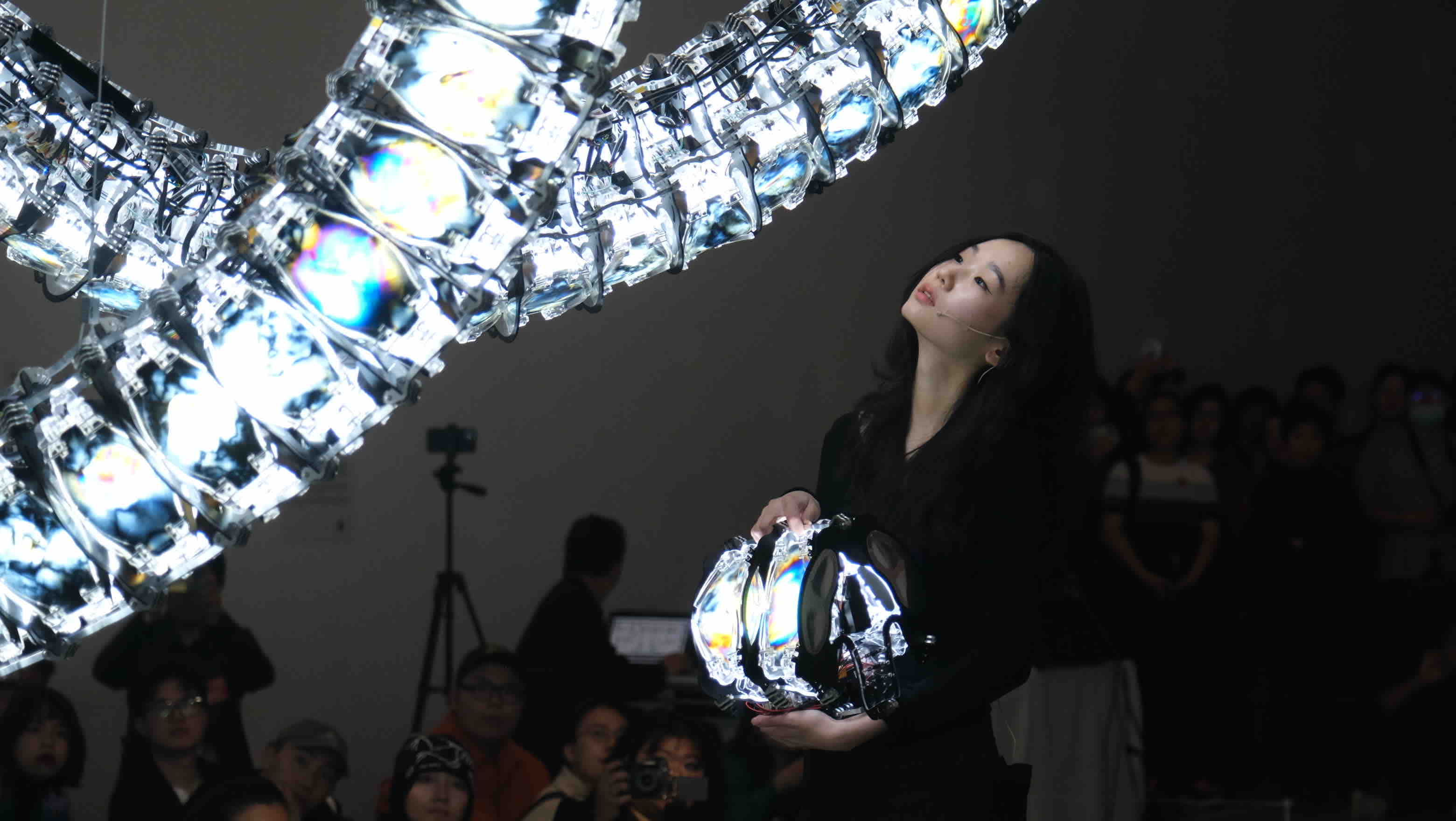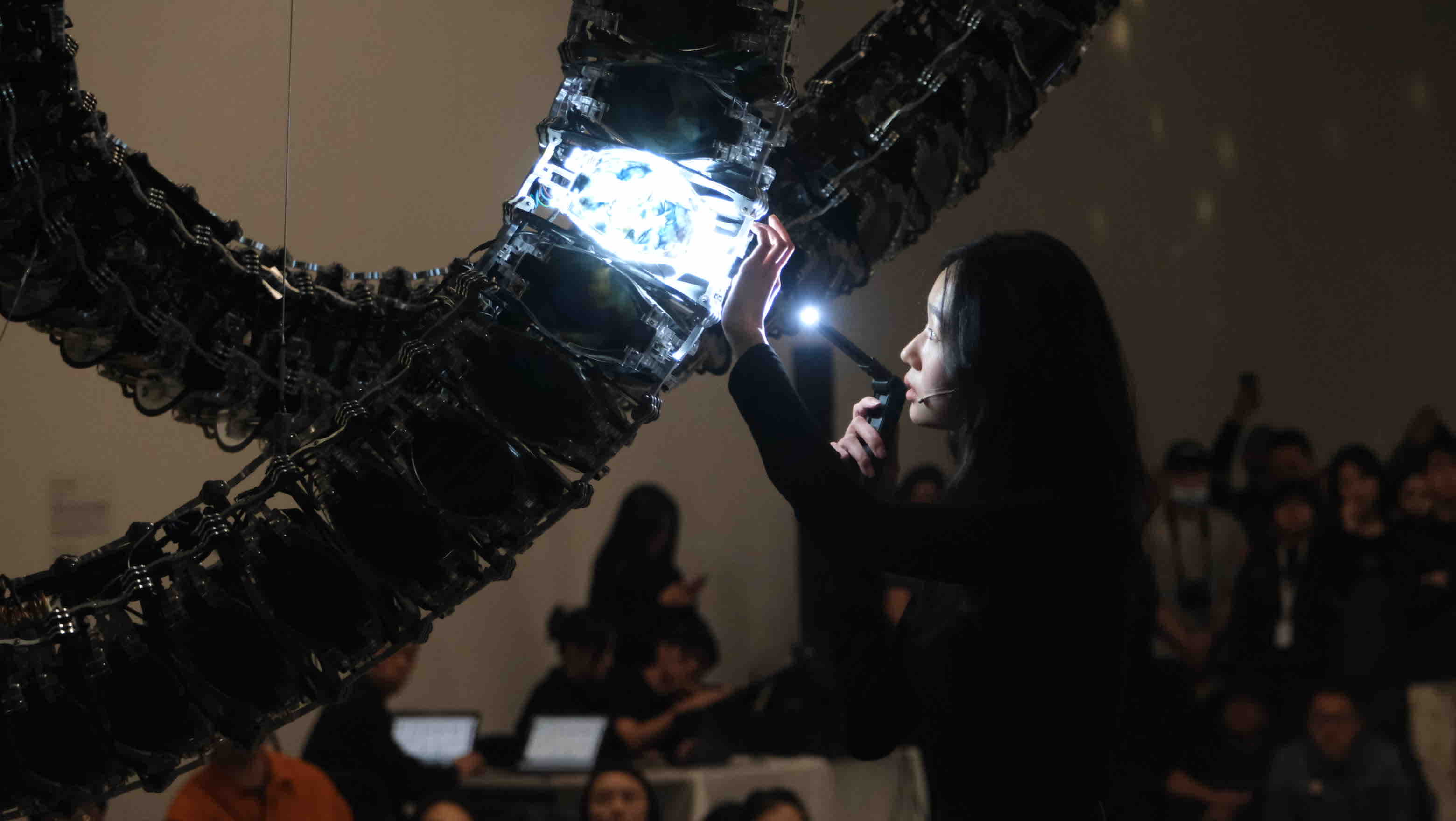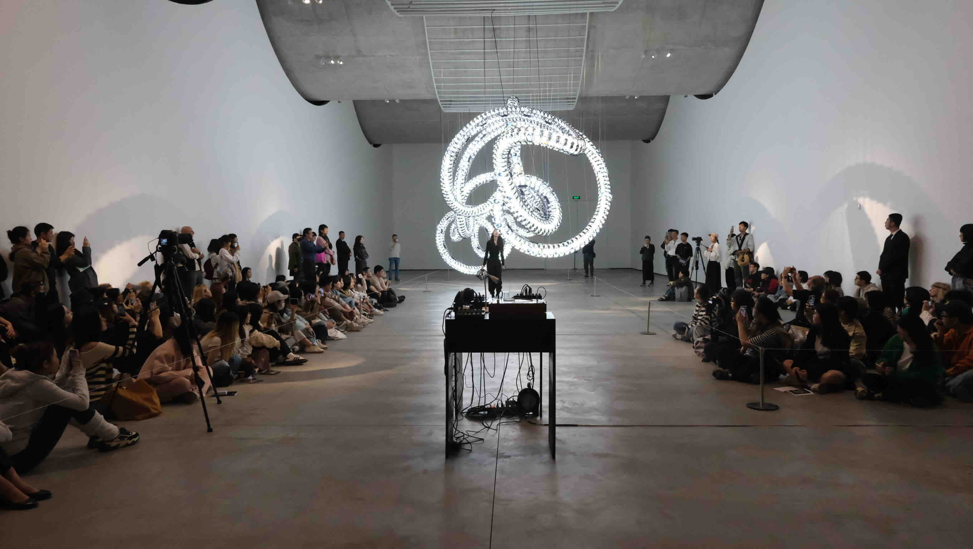 通过这场表演,那些宇宙粒子、机器和人类的不可见事件被直接呈现。展览空间已经变成了一个充满漂浮材料、宇宙事件和复杂机械装置的超现实世界,时间和空间上下颠倒,随着“身体”的出现,变回潜在的现实。表演者与作品的互动,就像想象中的向导、守护者和居住在展览空间的幽灵,就像日落时的余晖,太阳的残余散布在空气中,表演创造了梦境的现实,对于那些还没有从梦中醒来的人来说,幻觉变成了现实。人类、物质、空间和自然以它们自己的权利在空间中移动。这不是学科之间的聚变,而是一次相遇;亦不是超越,而是一次共融。