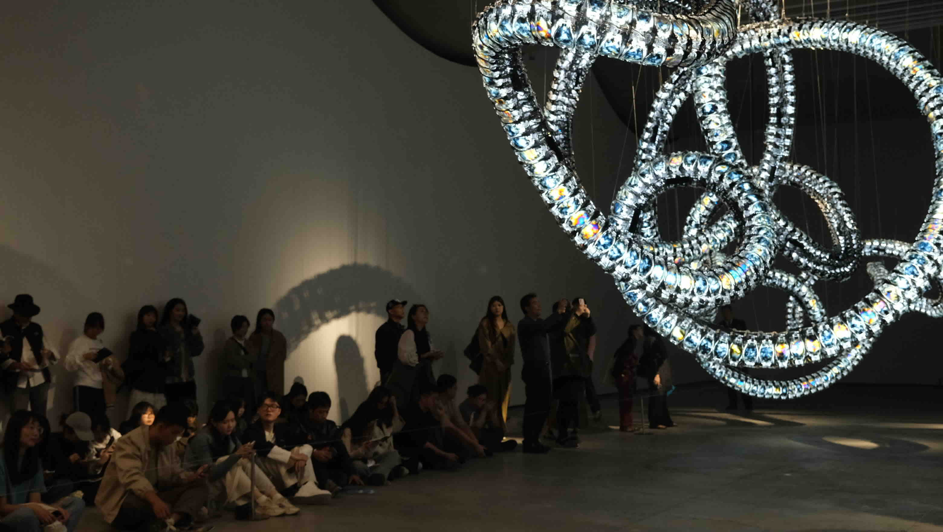 这次展览由张尕作为策展人,是金允哲迄今为止规模最大的个展览。10余件大型动态艺术装置,将展览空间、宇宙、观众,紧密交缠于同一宇宙事件。展览现场中,金属的光泽与岩石的质感交织在一起,为观者勾勒出浑然天成的跨时空景象,和充满未知的神秘世界。以“ 两极椭圆”为主题,金允哲将生命与死亡视为一个统一整体,而非彼此对立的两极。生与死不再被视为终点,而是一个永恒的循环过程,构成生命的无限律动。也是一个转化的过程,实现了生命的不断重生与循环,不受时间和空间的限制,超越了物质世界的束缚。在这一理念中,金允哲又强调了在人类社会、科学技术和自然世界中,万物共生,紧密相连的依存关系。不同事物之间相互纠缠、相互影响的状态,如他的作品一般相互关联,相互作用,并成就彼此,引发人们对生命、存在和宇宙意义的深刻思考。