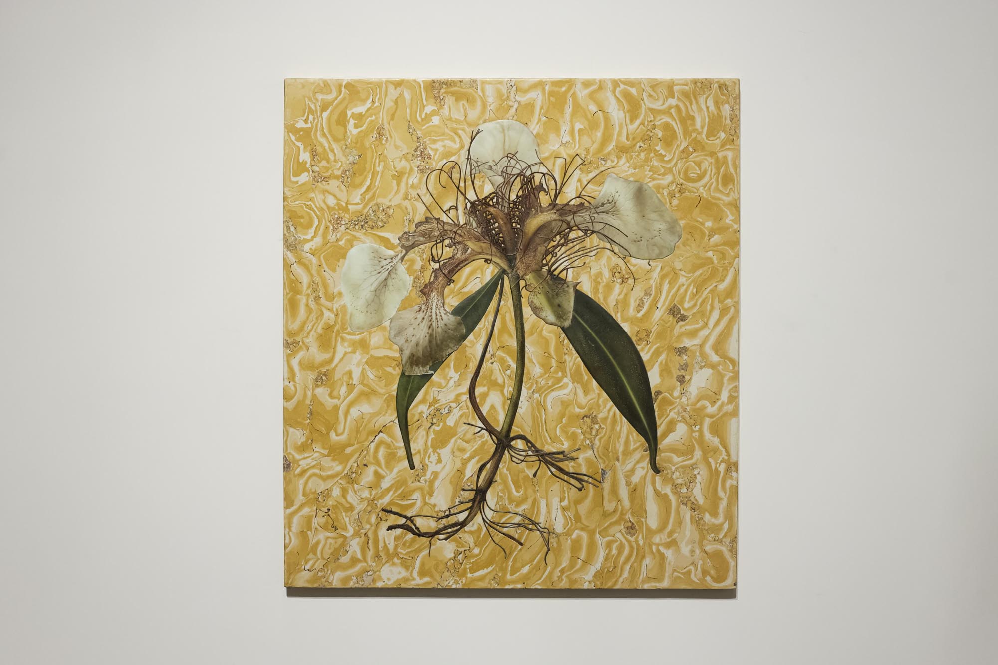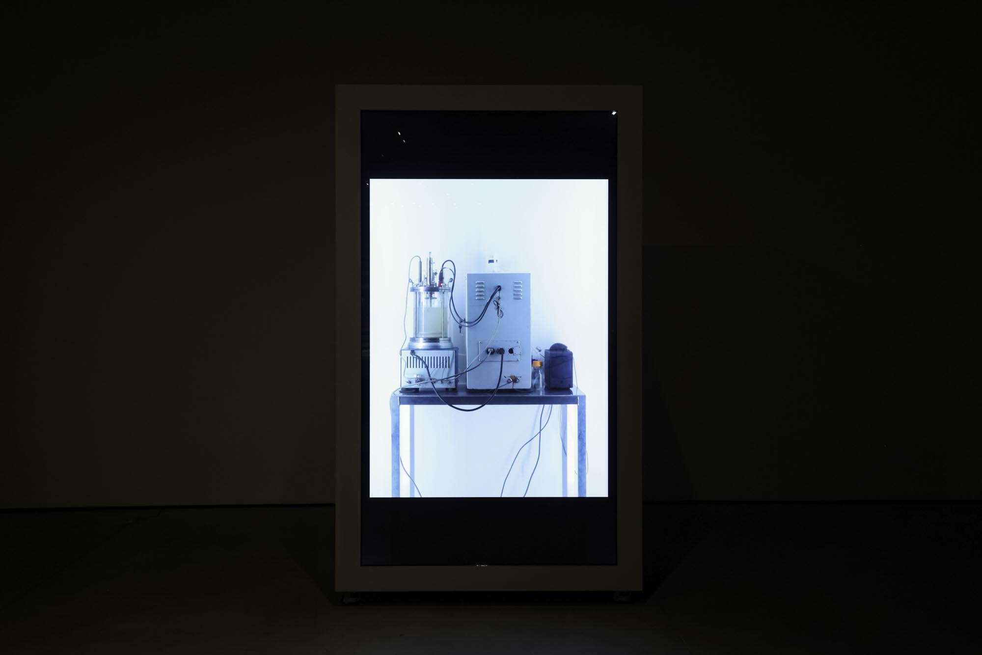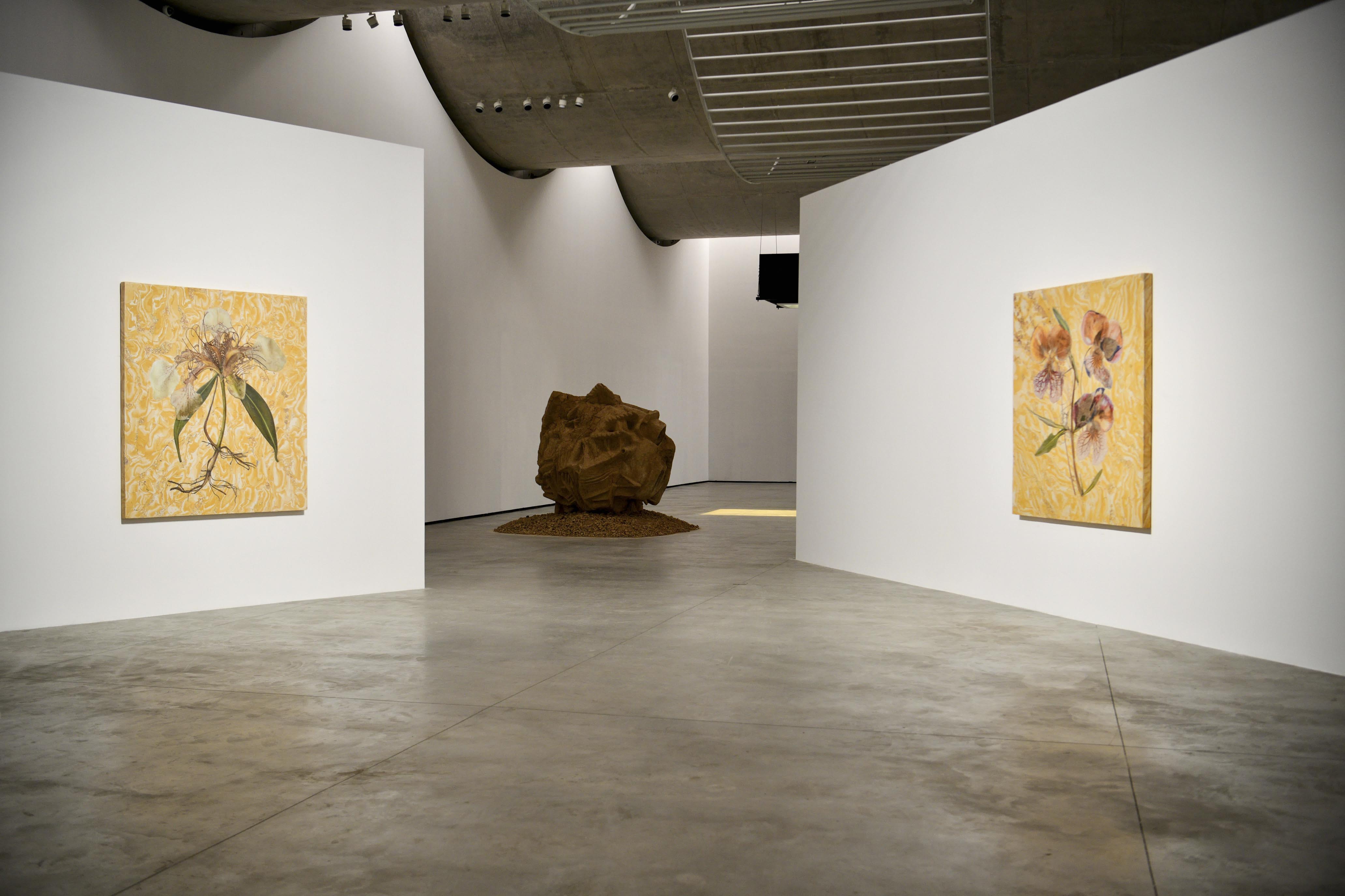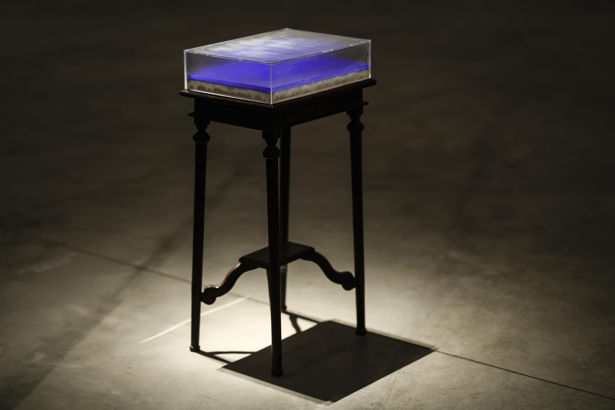 这种多孔的边界进一步延展至其他作品:《被植物缠绕的可疑》(2013–24)中,杂草与细菌令废墟雕塑获得生机;《生物克莱因蓝》(2022)中,合成生物学孕育出全新的色彩;《定义》(2022)中,人类语言突变为真菌的DNA。代码成为咒语,生命化作铭刻——正如《勾勒姆》(2022)所示,泥土在生物数据的驱动下呈现出脆弱的人形,预期了走向未来的考古。《遗忘的记忆》(2024)吐纳出数万年前冰川的空气,复活了史前的亡灵气息。在这里,短暂与永恒对峙。