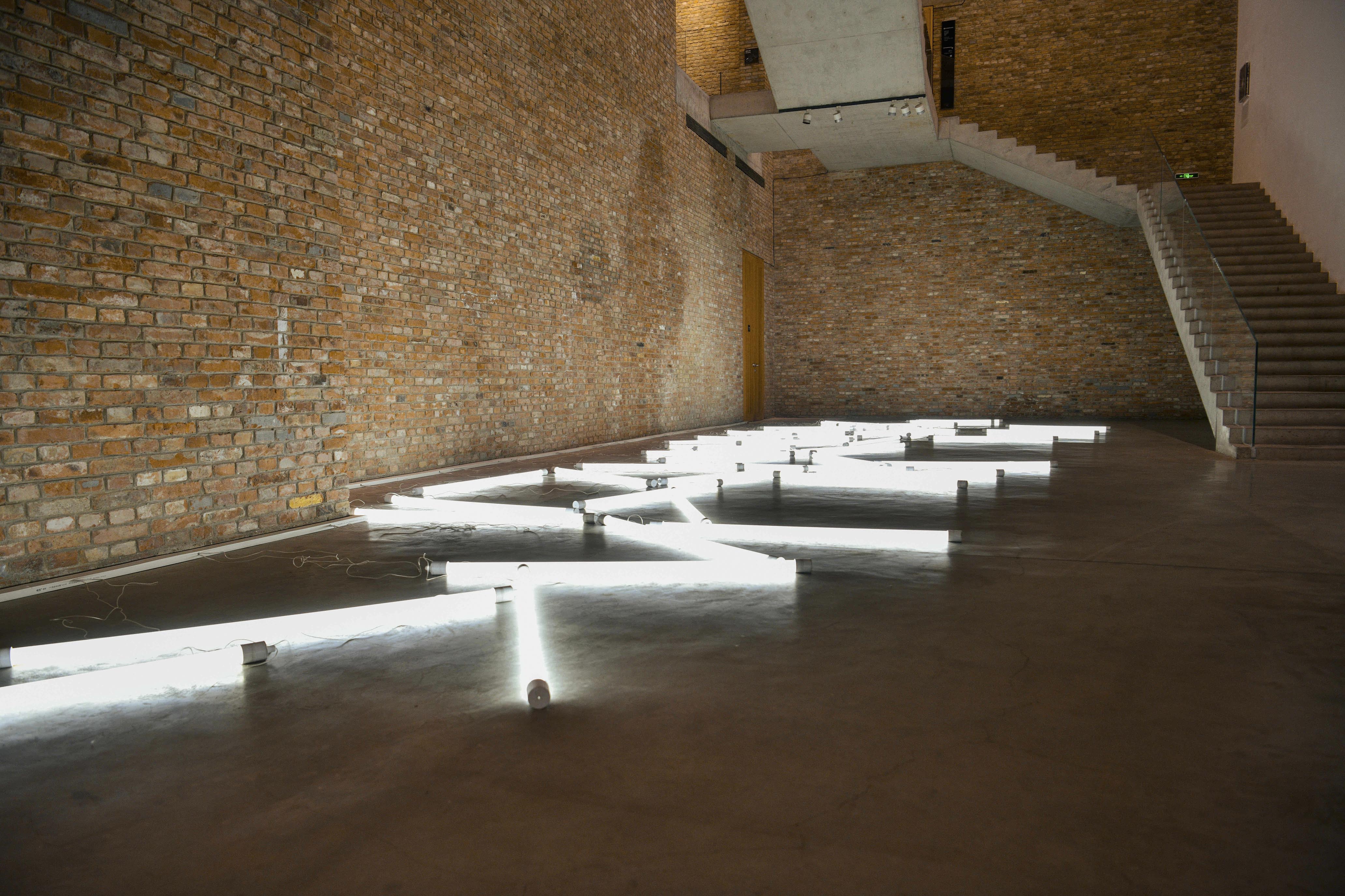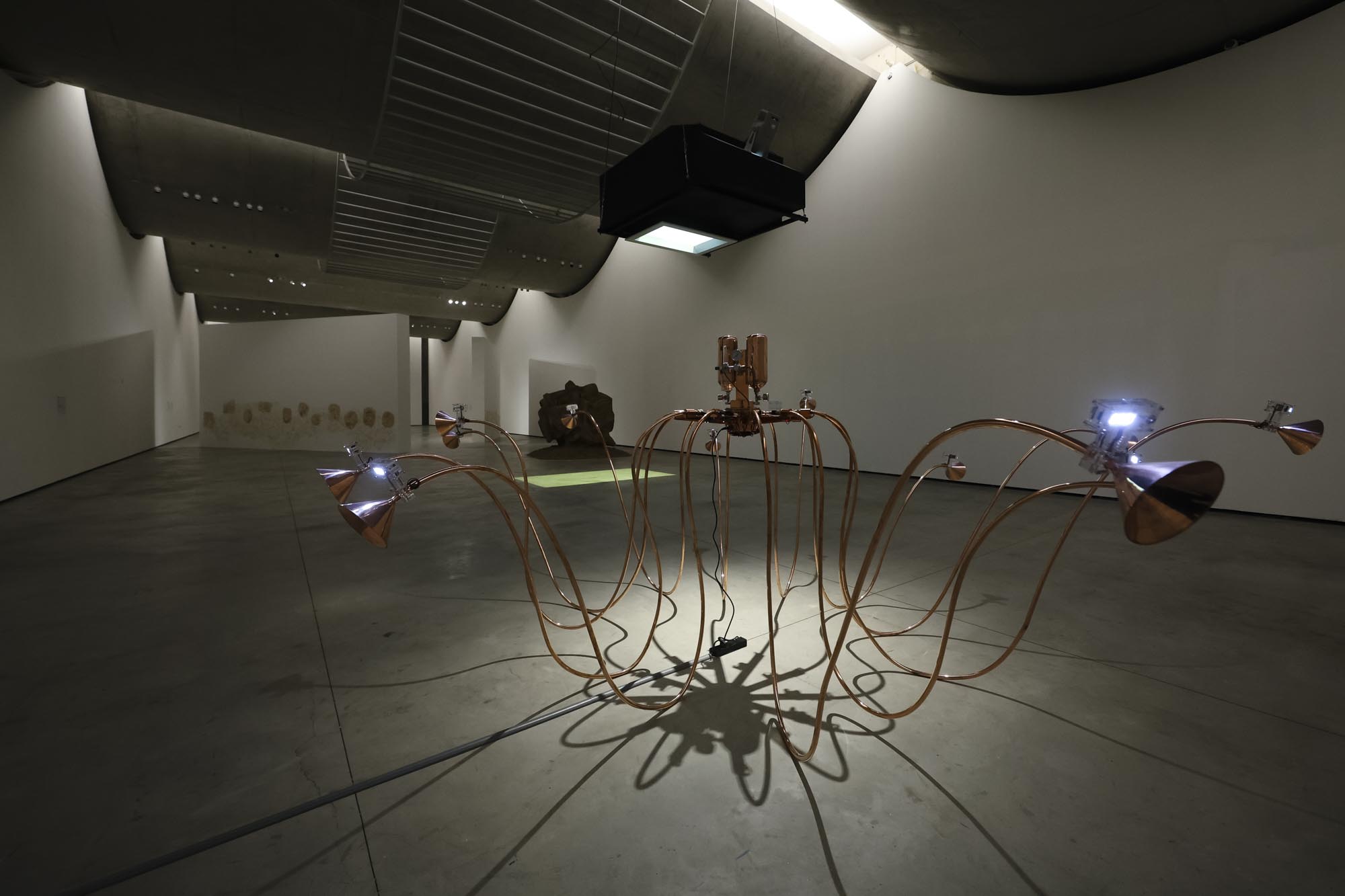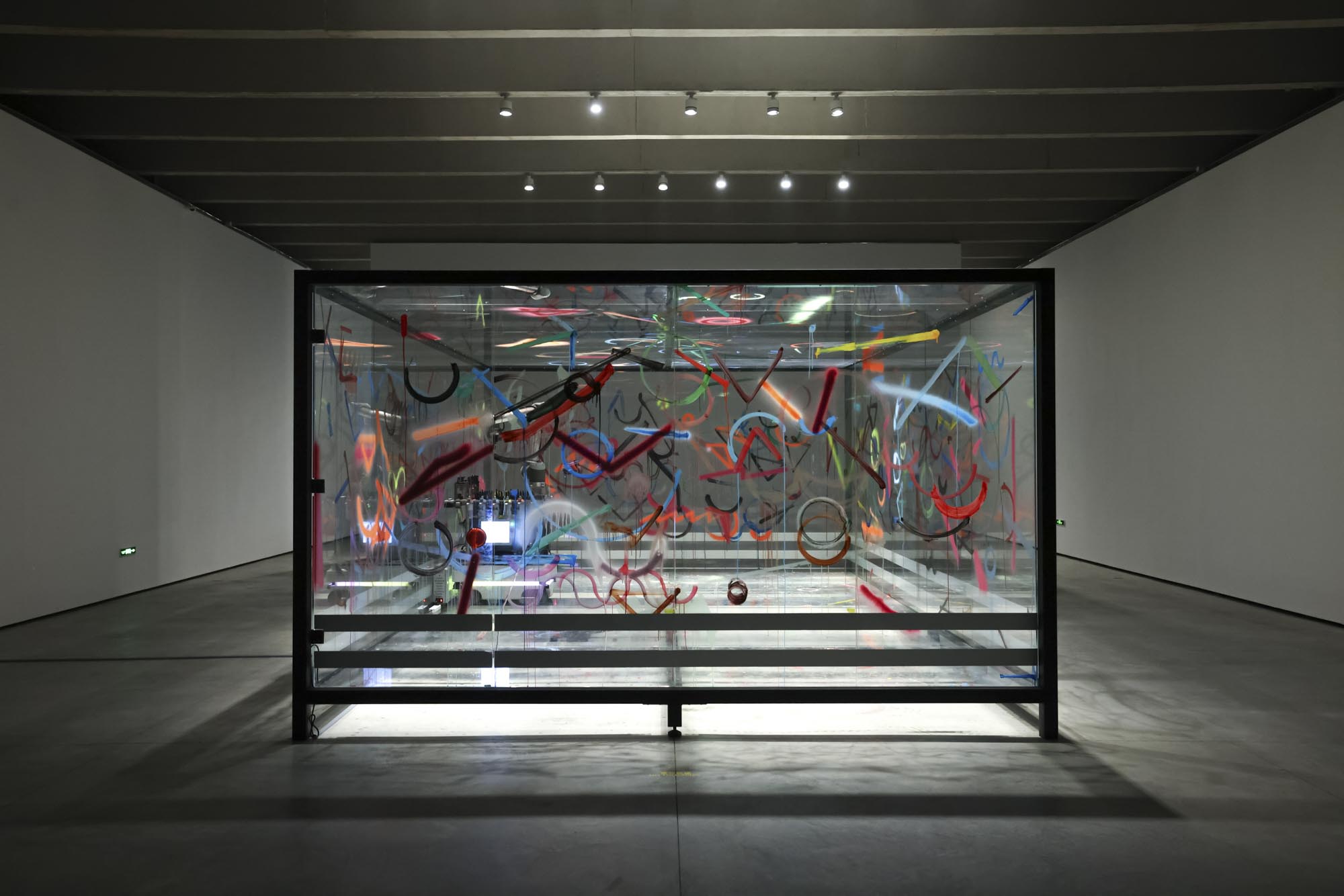 如果说自2012年持续至今的《王郁洋#》系列标志着从拟人化物体向另一层阶智能的转向,那么在798CUBE门前矗立的《共生》(2013–24)则以纪念碑式的庄严提出另一种和解:人类的幻想与机器的偶发相互纠缠,正是“ChatGPT时代”来临之际的先见之思。旁边,一只直径一米的金属球体经由人眼运动训练的人工智能操控,在前庭滚动并《凝视》(2022-)着来访者——一种诡谲的提醒:自主性本是双向的通道,惰性的事物也可能潜藏着生命的气息。进入展厅,摇曳的光管聚合成群落,上演一场非随机、也非拟人的机械舞蹈,却充盈着谨慎与欲望的节奏。生命变得人为,而人工亦化作生命。