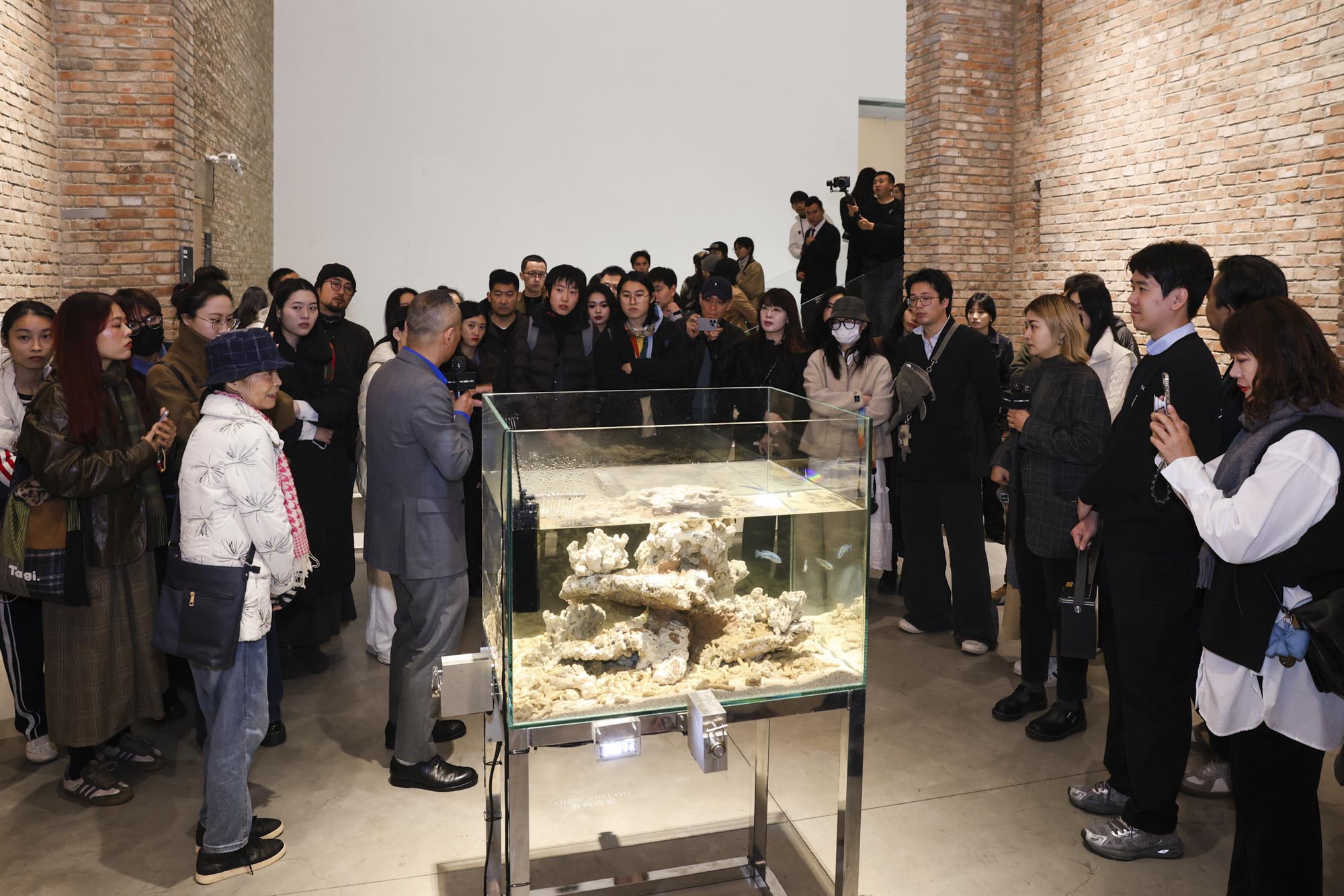 自此,熵的力量悄然渗入。《不可名状》(2024)中,随机的白点聚合成稍纵即逝的肖像;《崩塌》(2024)中,鱼缸在莫名的威胁下等待偶发的破碎;《放生》(2024)中,一只装有太阳能电池的机器人狗消失在罗布泊的荒漠。在这里,每件作品都上演着崩溃的必然——毁灭作为建造的孪生,偶然是程序自设的失控。